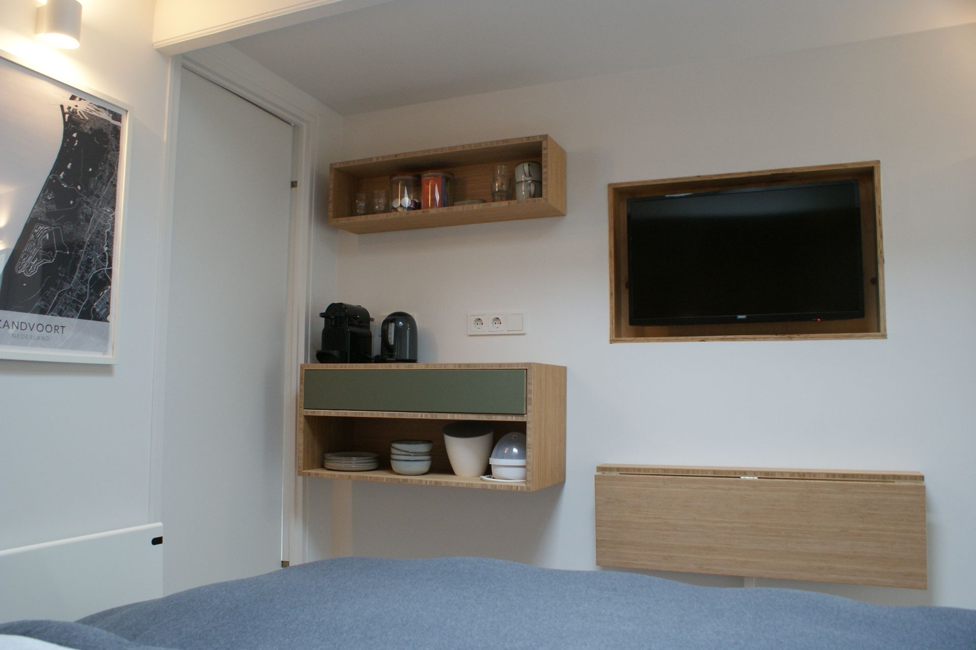 Achter het woonhuis is een zomerhuis, die in het verleden werd gebruikt voor opslag. Het zomerhuis is volledig gestript, geïsoleerd, de entree is verplaatst en alle leidingwerk is aangelegd. De uitdaging was om in een kleine ruimte zo praktisch mogelijk in te richten. De afwerking moest een luxe, Scandinavische uitstraling krijgen. Grotendeels van de meubilair is ontworpen door ons en op maat gemaakt. Er is oog voor details, zodat de gasten een fijn verblijf hebben en aan niks ontbreken.